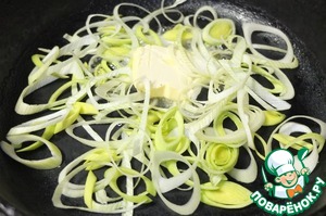 Обжариваем на сливочном масле тонко нарезанный порей.