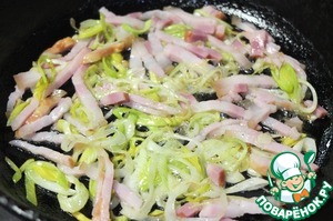 Добавляем бекон, нарезанный полосками. Обжариваем 3-4 минуты. Снимаем с огня.
