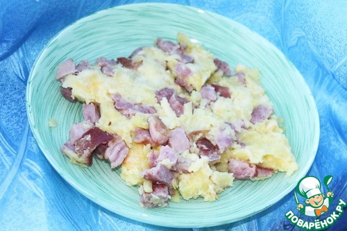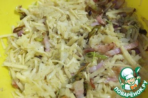 В картофель с сыром добавляем обжаренный лук и бекон, перемешиваем.