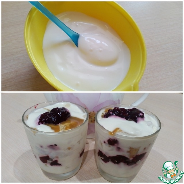 [+5]А десерт у меня получился другой: я давно пускала слюни на рецепт быстрого и легкого соуса из вишни, найденный здесь же. Так что в стаканчики выложила слоями сливки (чуточку подслащенные приготовленным и остывшим карамельным соусом), поломанные печеньки (завалявшиеся в шкафу еще с месяца два назад) и вот этот вишневый соус. Сверху еще капнула карамельным соусом. Мммм....ням-ням-ням. Ну и вкусно же вышло!
