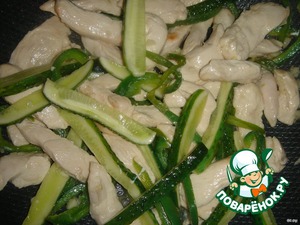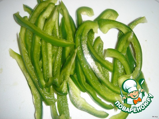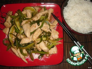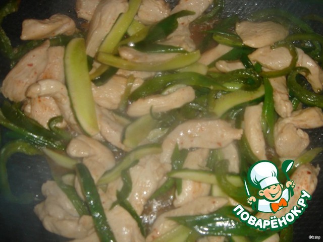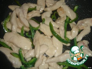 На разогретом в большой сковороде масле обжарить перец около 30 сек. Добавить полоски курицы и продолжать жарить, помешивая, пока курица не прожарится. -