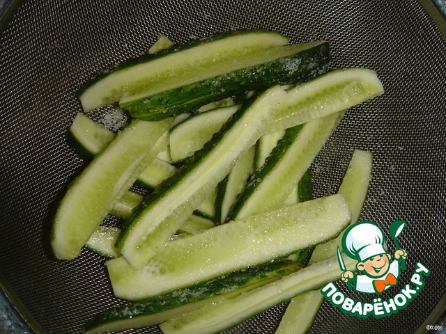 Огурцы порезать вдоль длинными полосками шириной не больше 5 мм. Положить их в дуршлаг, присыпать солью и оставить минут на 10-12. Затем тщательно промыть, отжать и обсушить на бумажных полотенцах.
