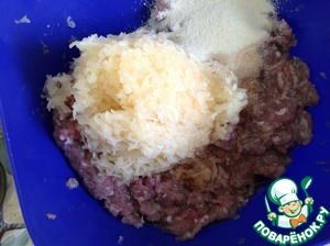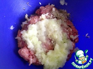 В фарш натереть на средней терке лук и чеснок на мелкой терке, добавить специи, перемешать. -