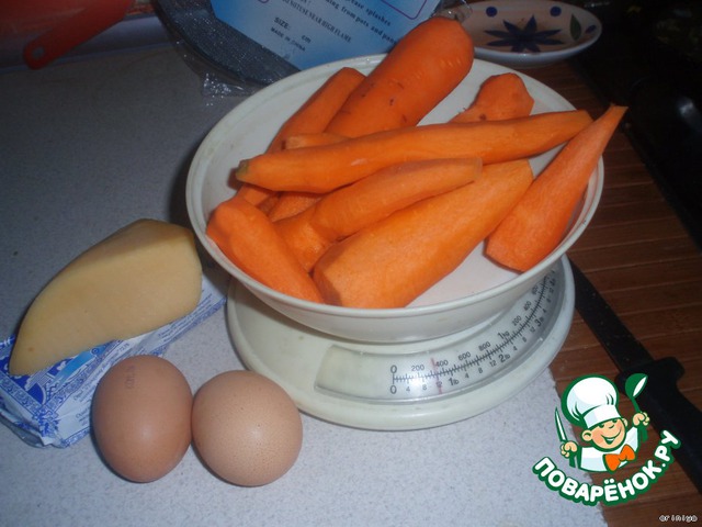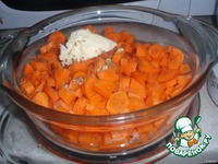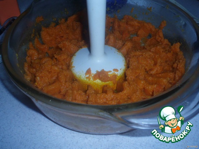 Отварить нарезанную морковь с маслом и приправами, сахаром. Лучше положить корицу, но мне захотелось имбирь. Убивает вкус моркови. Слить лишнюю жидкость. Перебить