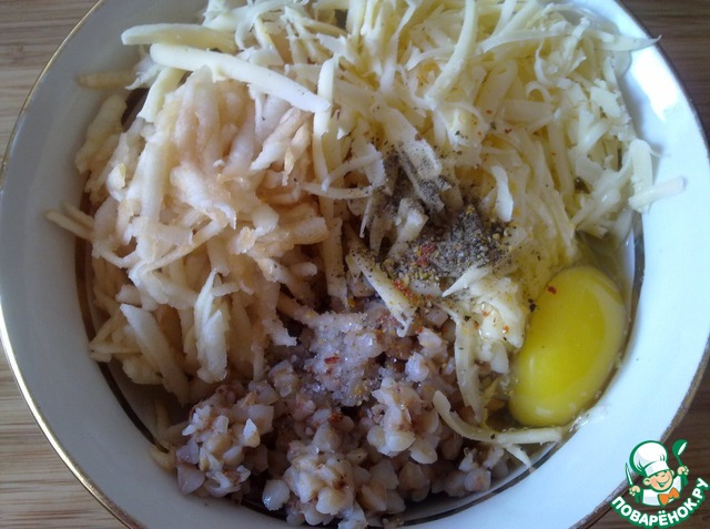 Моем яблок и снимаем кожуру, натираем на крупной терке. Сыр также натереть на крупной терке. Затем измельченные продукты и яйцо добавляем в остывшую гречку, все хорошо перемешиваем. Посолить и поперчить по вкусу.