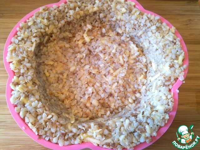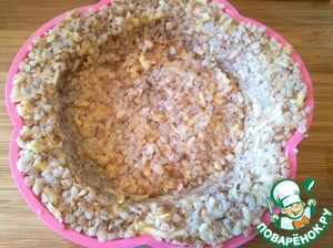 Берем силиконовую форму и из гречневой массы выкладываем бортики и дно.