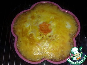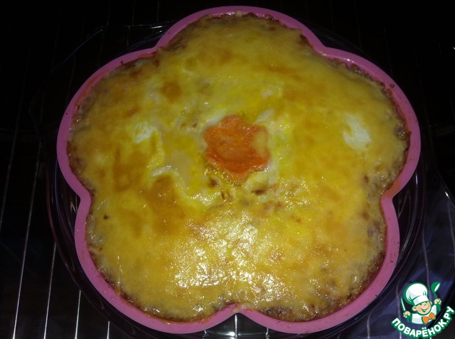Духовку разогреваем до 200 градусов, отправляем в нее на 20 минут нашу запеканку. Спустя положенное время присыпаем запеканку оставшимся натертым сыром и выпекаем еще примерно минут 5, до образования красивой золотистой корочки.