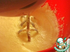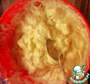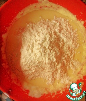 Смешайте муку и разрыхлитель. Добавьте их в смесь, замесите тесто.