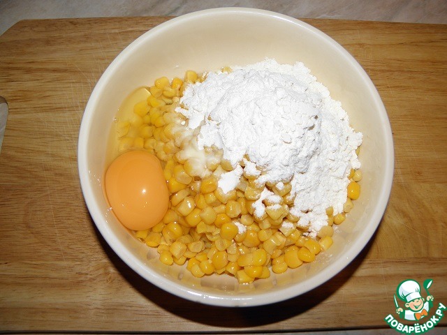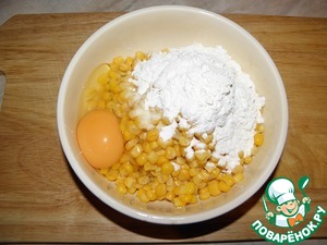К кукурузе ( вместе с соком из банки), добавить муку и яйцо.