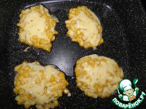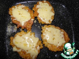 На сковороде разогреть масло, выкладывать массу ложкой, сверху посыпаем сыром, накрываем крышкой. и готовим минуты 3 на небольшом огне