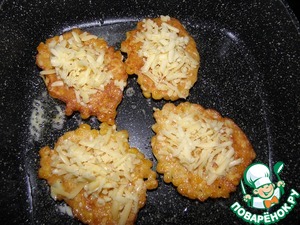 Затем переворачиваем оладьи на другую сторону, и так же посыпаем сыром, и снова накрываем крышкой еще на три минуты.