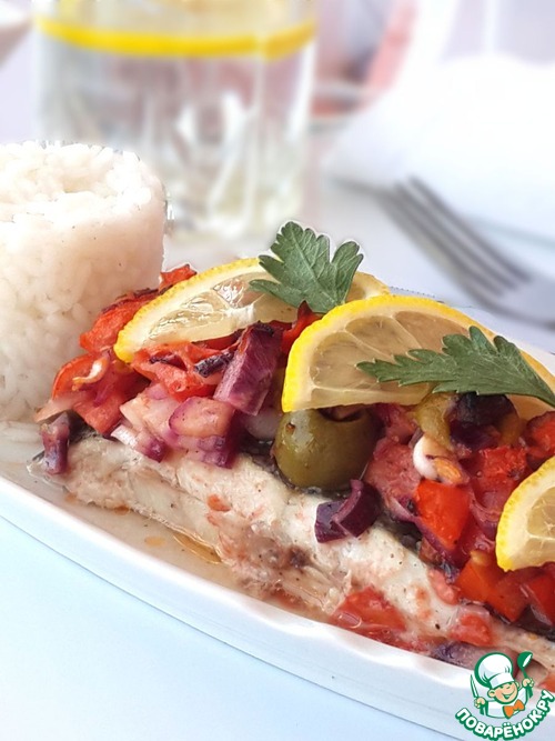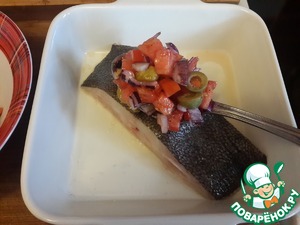Кусок камбалы положите в форму для запекания, слегка посолите со всех сторон и выложите сверху овощи