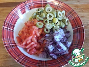 Нарежьте мелко помидор, красный лук, оливки, слегка посолите, приправьте перцем и травами и смешайте с оливковым маслом