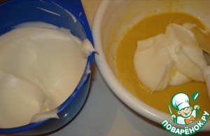 соединить масляно-желтковую массу с сухими составляющими, получается гладкое воздушное тесто.