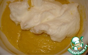 Добавить к масляному тесту 1/4 взбитых белков и лопаточкой перемешать методом складывания до однородности.