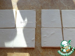 Пласты теста чуть разморозить (не до конца, чтобы хорошо резалось), разрезать на 8 квадратов;