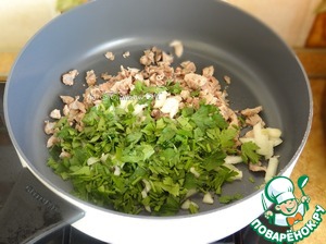 Сковороду смазать маслом, выложить утку, шинкованный лук и зелень (у меня петрушка+кинза);