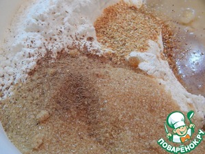 В миску просеиваем муку. В нее добавляем сахар, масло, корицу, ванилин, вино.