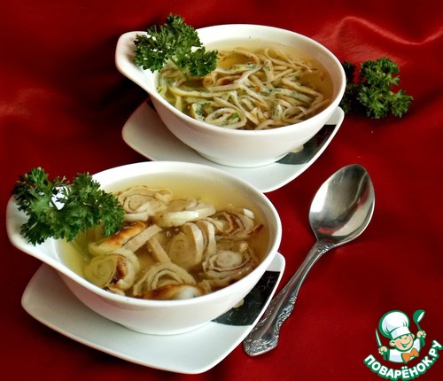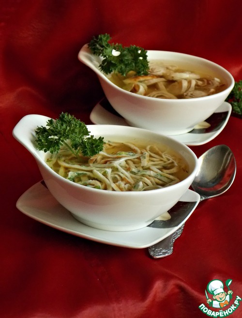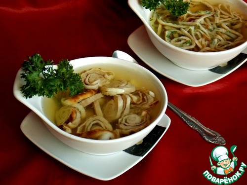 В тарелку налить консоме и положить блинную соломкой. Подавать сразу.