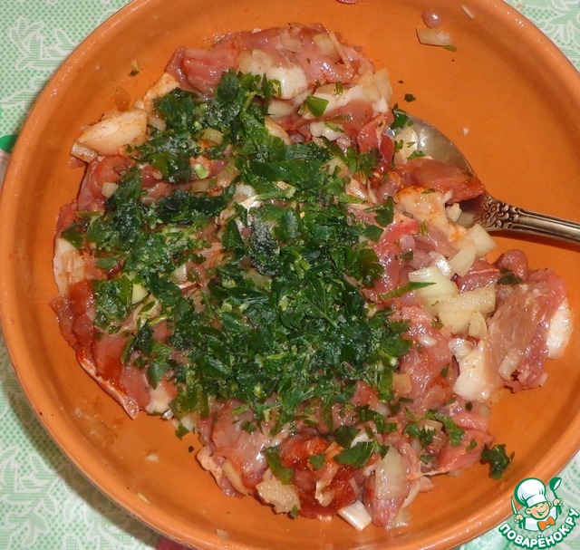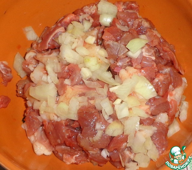 Добавить лук к мясу. Посолить по вкусу, добавить черный и красный перец.