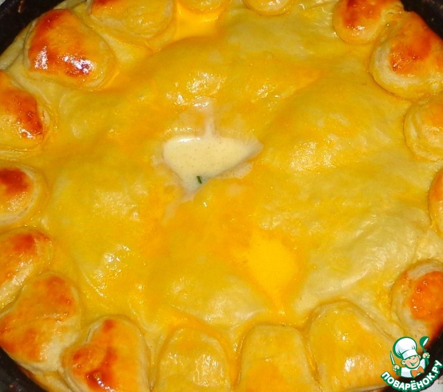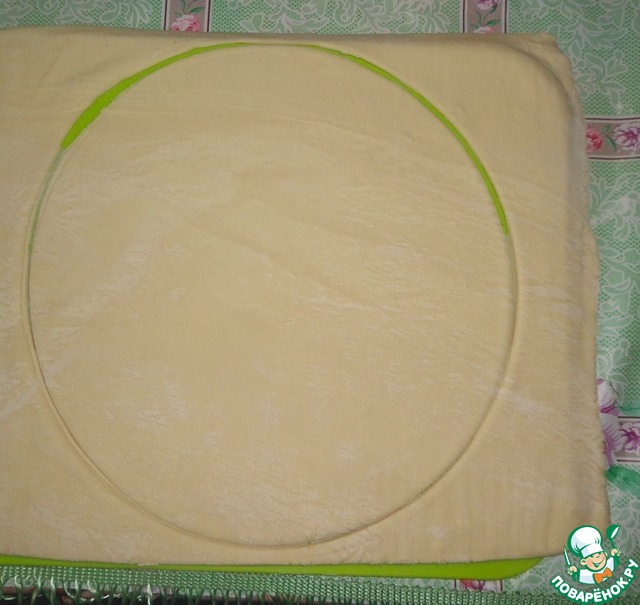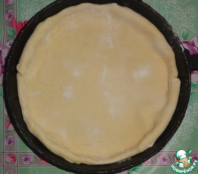 Слоеное дрожжевое тесто раскатать размером под форму. Одну часть тесто кладем в сковороду.