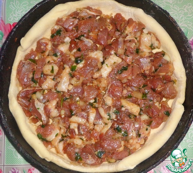Пирог поставить в духовку. Выпекать при 200 градусах около 45 минут (когда пирог подрумяниться, то в отверстие аккуратно вылить заливку и отправить пирог еще на 10 минут).