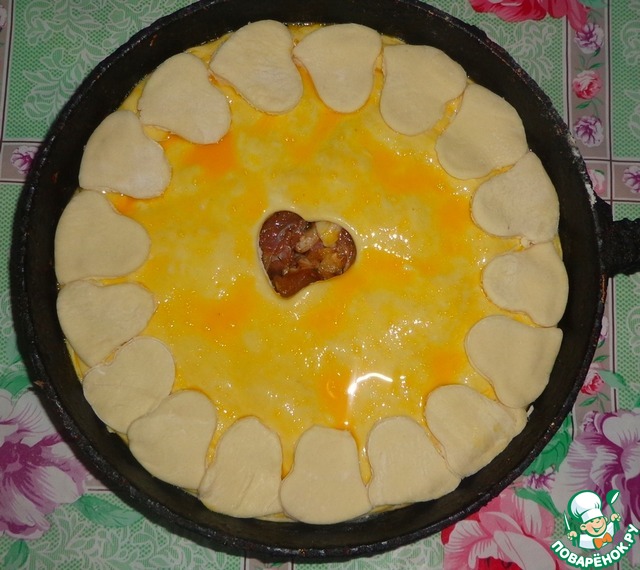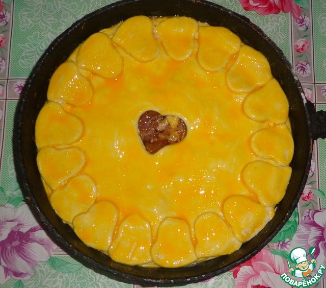 Накрываем второй частью теста. В середине сделать небольшое отверстие. Смазать желтком. Из остатков тесто вырезать сердечки и разложить их по краю пирога.
