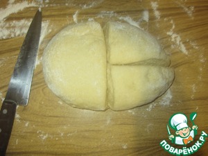 Разделить тесто на три части, сначала делим кусок теста на 2 части и одну из двух еще раз пополам