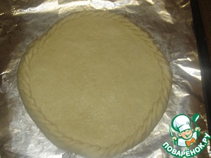 Третий раскатываем таким же диаметром что и второй пласт, поднимаем бортик первого пласта и соединяем формируем пирог, можно делать на сковородке или в форме для выпечки, делала на противень. Верхний слой наколоть