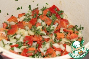Как только подливка будет готова, сразу же положить в неё, лук, петрушку и перец и, не снимая с огня, перемешивать в течение 5 минут. -