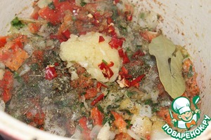 Добавить чеснок, лавровый лист, майоран и стручковый перец.