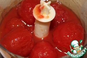 С помидоров снять кожицу и вместе с соком измельчить их в блендере.