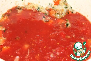 Кастрюлю снять с огня и добавить, перемешивая, томаты вместе с соком.