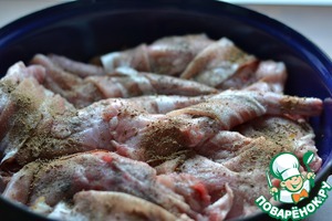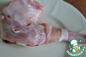 Каждую лапку (ножку) кролика обвернуть кусочком бекона.
