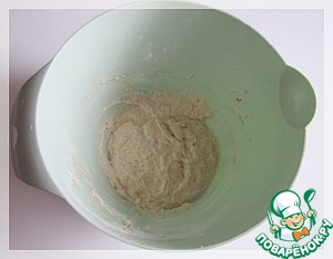 Смешать теплую воду, ложку сахара, дрожжи и 3/4 стакана муки. Накрыть пленкой и оставить опару для подъема в теплом месте на 1 час.