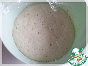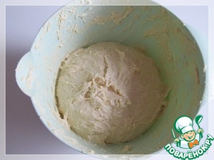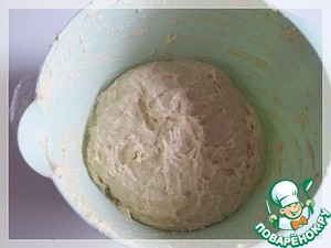 Высыпать всю муку и хорошо вымесить тесто до тех пор, пока тесто не будет прилипать к рукам. Опять накрыть и поставить на расстойку на 45 минут.