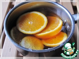 Пока пирог печется, приготовим пропитку. В крепкий чай добавить сахар (его количество можно и уменьшить), нарезанные кружочками апельсины, лимоны, варить до тех пор, пока чай не превратится в сироп. Вынуть фрукты и добавить ром.