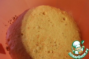 Для начала приготовим опару. Смешать все ингредиенты в глубокой миске, накрыть полотенцем и оставить на 20 минут - до появления пышной шапочки.