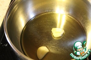 Пока тесто отдыхает, займемся соусом. Для этого в ковше разогреть масло, затем добавить раздавленный чеснок. Немного прогреть.