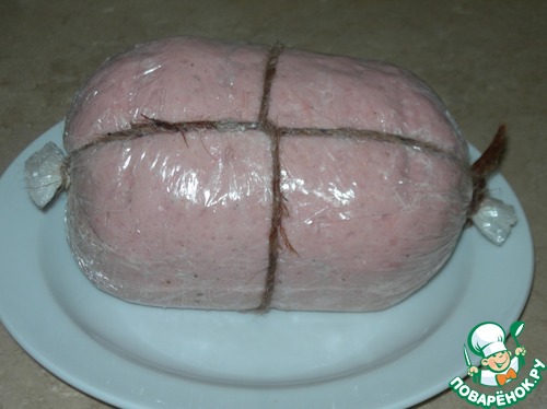 Далее набиваем оболочку фаршем, желательно с минимальным количеством воздуха, уплотняем батон и вяжем хвостик. После чего сделать поперечную вязку, для лучшего уплотнения.