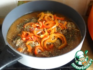 Посыпать чесноком, сушеной смесью, добавить горчицу, сверху выложить нарезанный полосками болгарский перец.