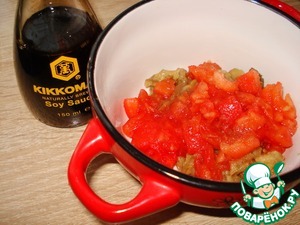 С помидора снимем кожицу, уберем семена и порежем небольшими кусочками. Перемешаем с мякотью баклажана, если надо добавьте по вкусу соевого соуса.