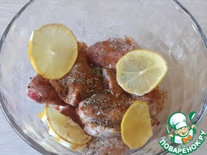 Сложите в глубокую миску крылышки, добавьте соль, коричневый сахар, перец, орегано и несколько кружочков лимона -