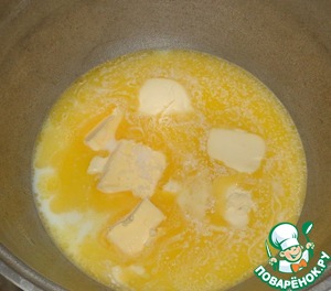 Нагреть молоко и добавить масло. Нагреваем на медленном огне до растворения масла.