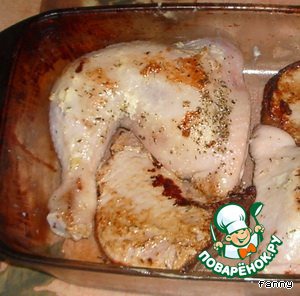 Укладываем курицу и свинину в форму.