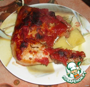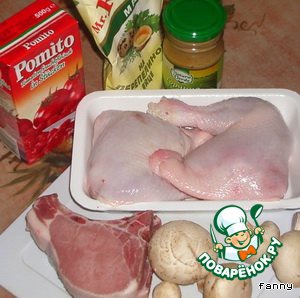 Это блюдо родилось благодаря жестокой жизненной необходимости: мой муж предпочитает свинину, а мне больше по нраву курица. Отсюда совмещение двух вкусов и двух начал - мужского и женского. Получилось совсем неплохо.