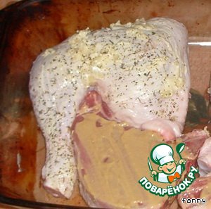 Окорочка смазываем майонезом, свинину - горчицей.