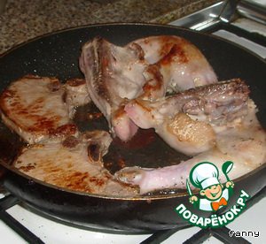 Затем на разогретой сковороде обжариваем мясо и курицу с каждой стороны минуты по 3. Солим, перчим. Выкладываем куски в форму для запекания. В той же сковородке слегка поджариваем порезанные шампиньоны, добавляем их к мясу.