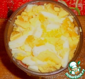 Измельчить отварные яйца и выкладываем слой. Заправка.