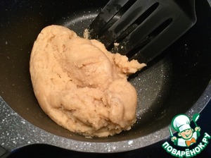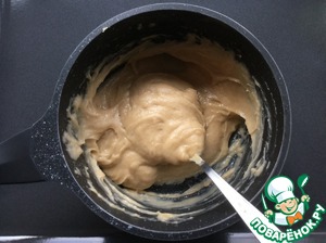 Как только смесь стала однородной, снимаем её с огня, даем остыть минут 10 и по очереди вмешиваем в тесто 2 яйца. Сначала вмешиваем одно яйцо, как только оно полностью войдет в тесто, добавляем второе яйцо и точно так же тщательно вмешиваем его в тесто.